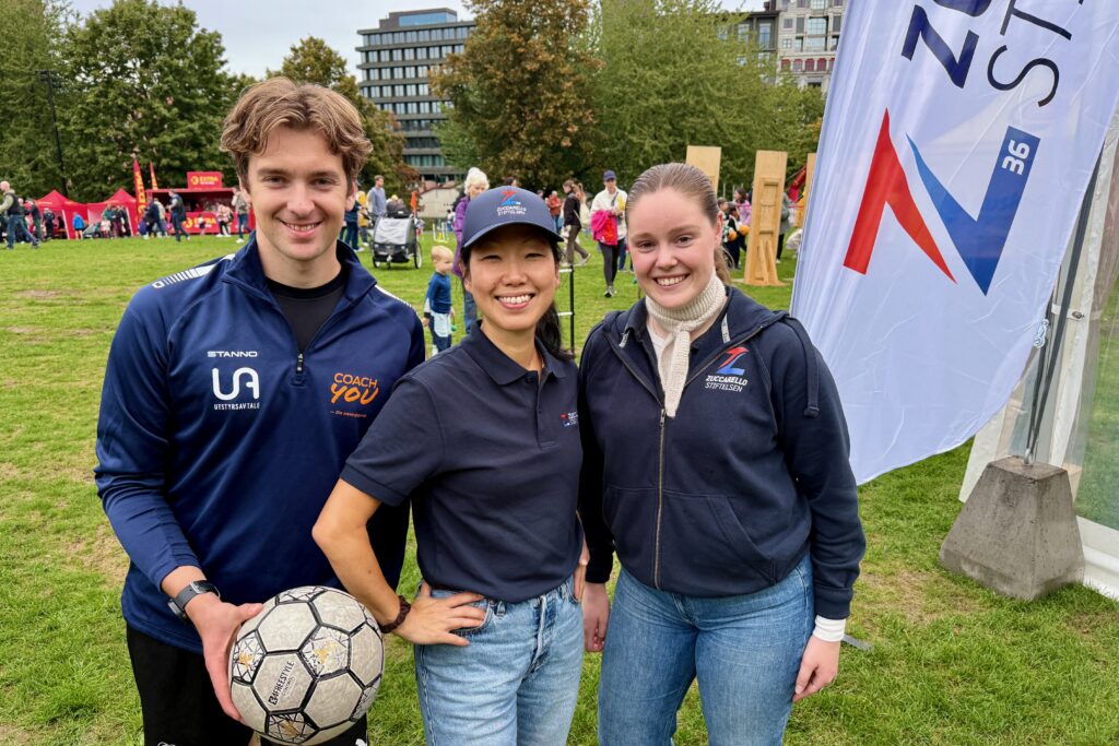 STAND: Zuccarellostiftelsen hadde stand på barneområdet til Oslo Maraton. F. v. triksemester Sindre Herre viste og lærte bort fotballtriks, leder for kommunikasjon i Zuccarellostiftelsen, Hanne Eide Andersen og prosjektkoordinator for Zuccarellostiftelsen, Mathilde Øgård. Foto: Zuccarellostiftelsen